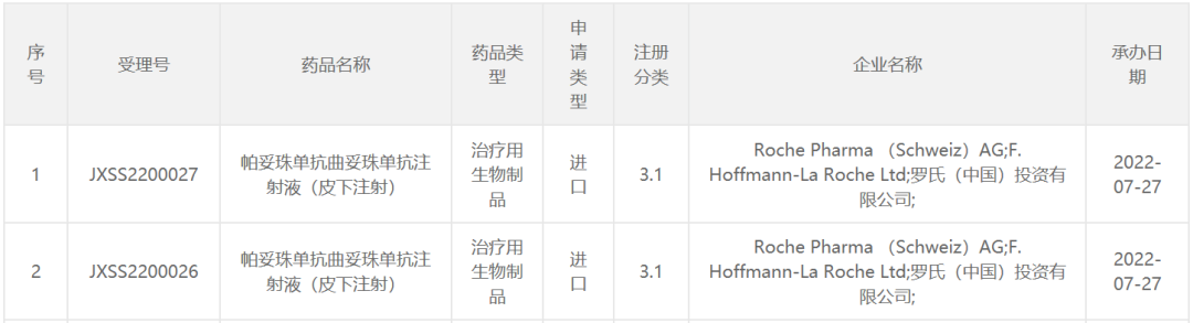 2022年7月27日,药审中心承办了罗氏制药递交的帕妥珠单抗曲妥珠单抗注射液(皮下注射)的上市申请。据公开资料,这是一款由帕妥珠单抗、曲妥珠单抗和透明质酸酶构成的一种固定剂量组合,为HER2 单抗复方(商品名为Phesgo)。