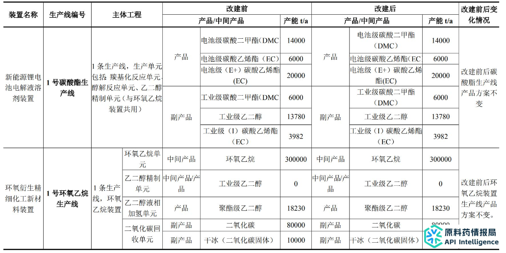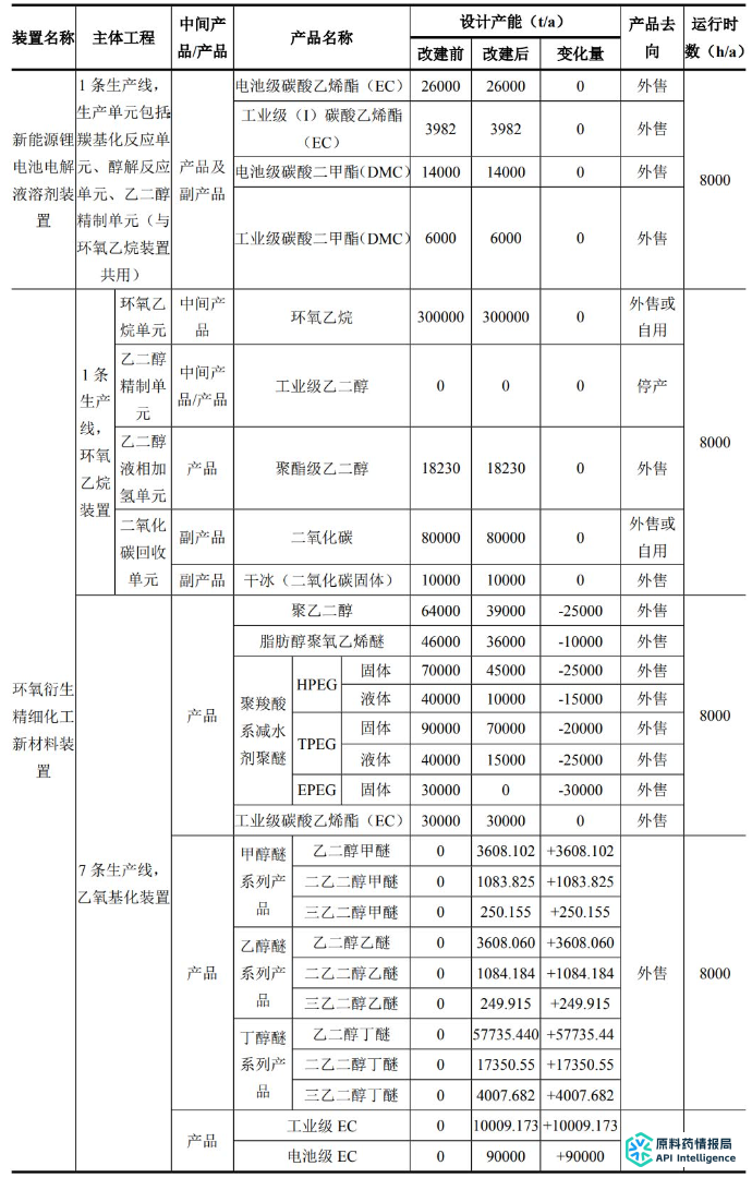 建设规模:对现有乙氧基化装置(EOD装置)和碳酸二甲酯装置(DMC装置)进行改扩建,分别改造内容如下:①乙氧基化装置(EOD装置):作为合成工段;②碳酸二甲酯装置(DMC装置):增加薄膜蒸发系统、精制系统。项目建成后可形成年产9万吨/年电池级EC和1万吨工业级EC产品,8万吨/年乙二醇丁醚系列产品,0.5万吨/年乙二醇甲醚系列产品,0.5万吨/年乙二醇乙醚系列产品。