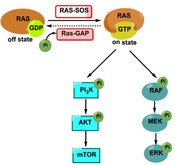 大多数KRAS突变发生在残基12或13,其中甘氨酸突变为半胱氨酸或天冬氨酸(例如,KRAS G12C、KRAS G12D和KRAS G13D)。在癌细胞中,突变的KRAS处于组成型激活状态,从而导致下游信号通路的激活,例如RAS-RAF-MEK-ERK或PI3K-AKT。