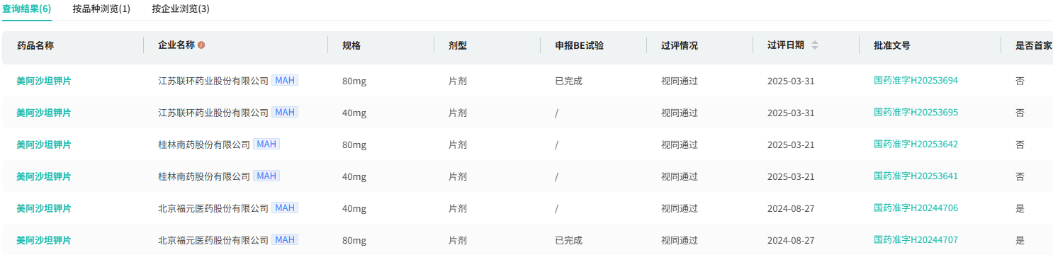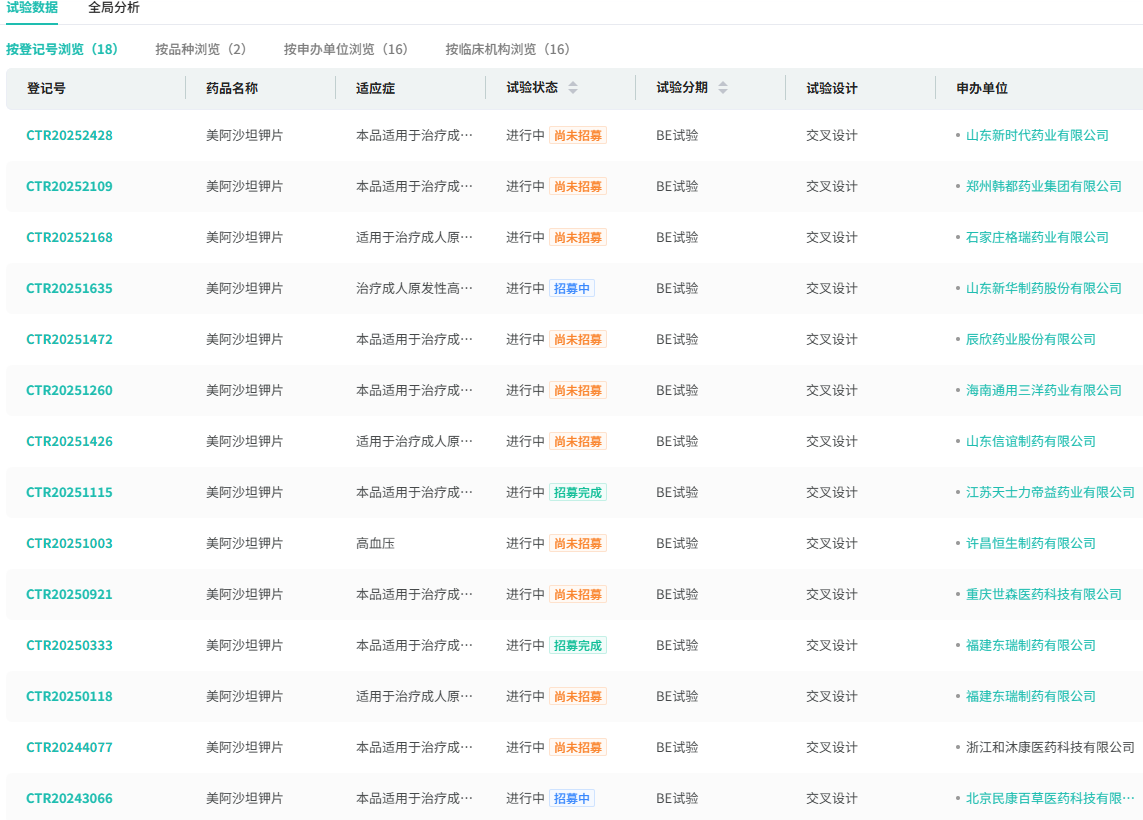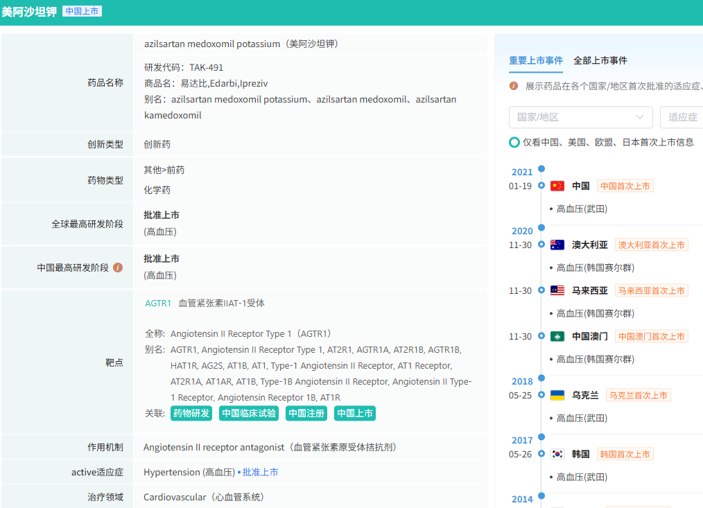 据悉,美阿沙坦钾片化合物专利已于2025年2月23日到期,制剂专利将于2028年到期。国内多家制药企业已布局该产品开发。