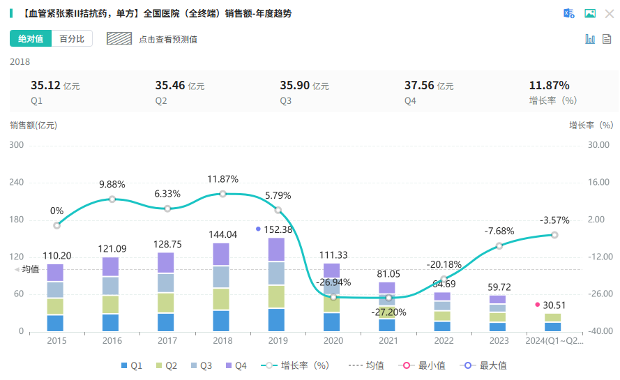 据摩熵医药数据显示,当前血管紧张素Ⅱ拮抗药累计销售额突破1693亿元,其中美阿沙坦钾片所属的单方拮抗药占据了1003亿元的市场份额。