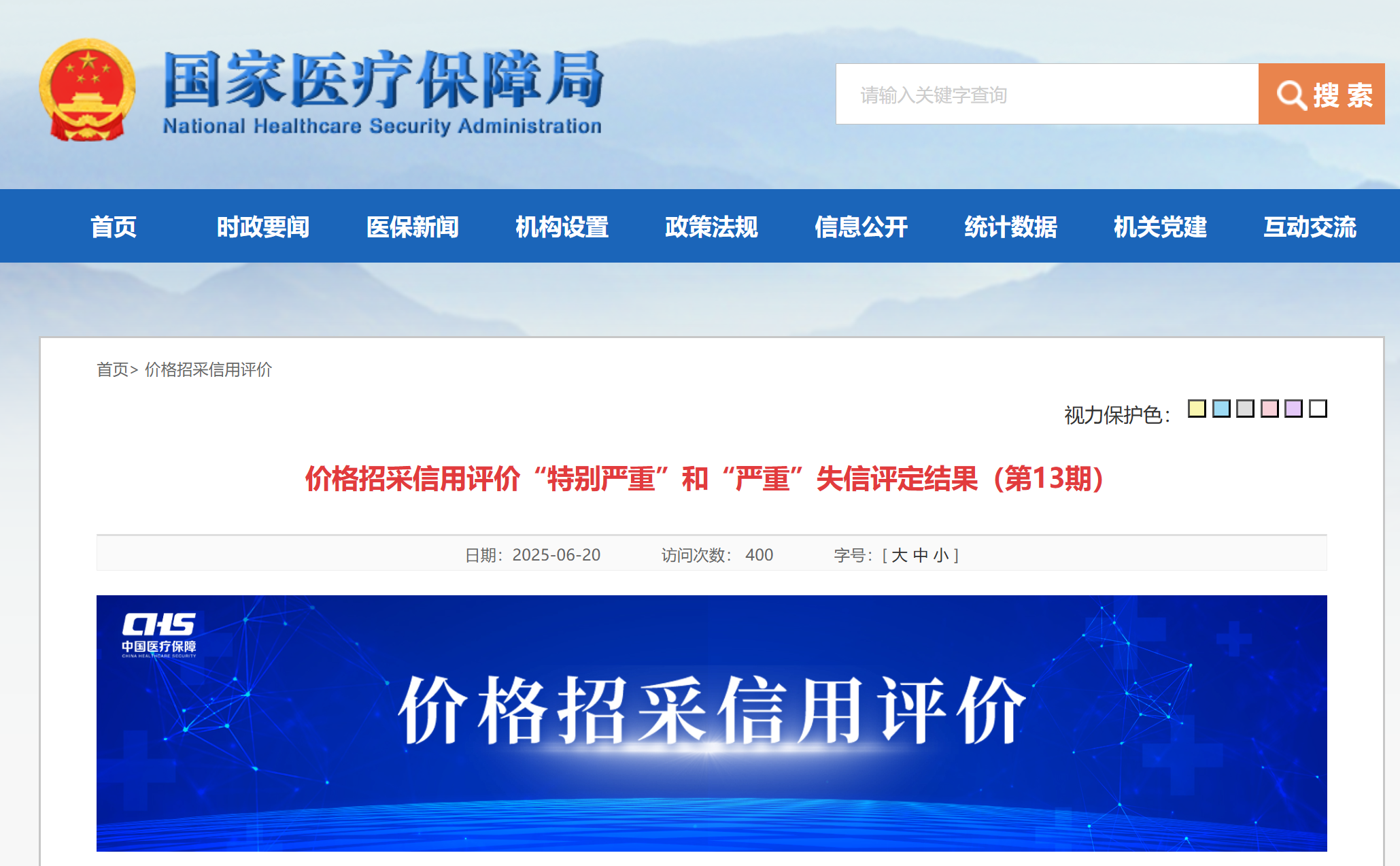 6月20日,国家医保局发布了《价格招采信用评价“特别严重”和“严重”失信评定结果(第13期)》。共51家,其中,药企为8家。