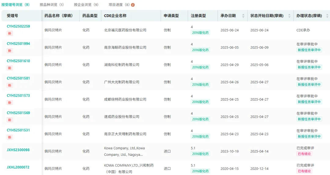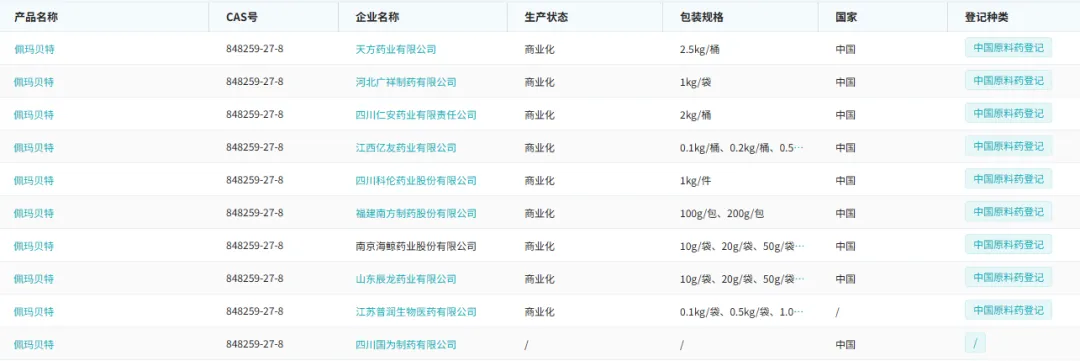 佩玛贝特的原料药,国内已有10家企业在CDE进行了备案。