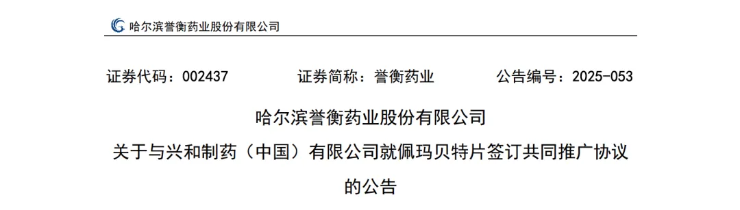 5 月 23 日,哈尔滨誉衡药业发布公告,6月1日起其将获得日本兴和制药原研新型降脂药物佩玛贝特片(商品名:派龙达)在中国指定区域的推广权,兴和制药将按协议向誉衡药业支付服务费及推广支持费,双方合作初始期限为2025年6月1日至2027年12月31日。