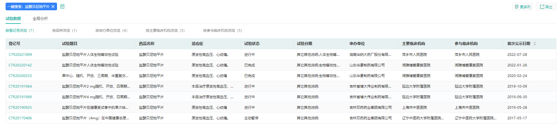 目前尚无其他企业提交盐酸贝尼地平片的仿制上市申请。不过据药融云中国临床试验数据库显示,湖南华纳大药厂、吉林省博大伟业制药和吉林双药药业正在开展并公示了盐酸贝尼地平片的BE试验。