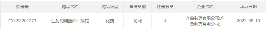 除了本次申报的齐鲁制药外,还有海南中和药业、海南天盛保和生物/海南皇隆制药和长春金赛药业递交了注射用醋酸西曲瑞克的4类化药仿制上市申请,另有深圳翰宇药业/辉凌制药递交了仿制药一致性评价补充申请,尚在审评审批中。
