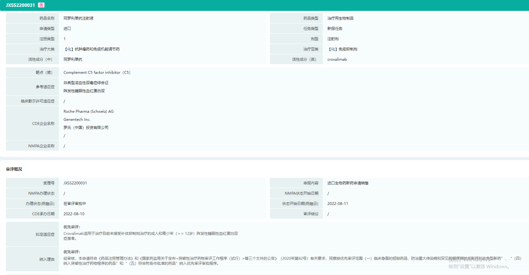 2022年8月10日,药审中心承办了罗氏制药的1类生物制品,C5抑制剂Crovalimab注射液(珂罗利单抗)的上市申请,并且被纳入了优先评审。目前罗氏制药还未在FDA提交上市申请,这可能是罗氏制药史上首个以中国作为全球首发的创新药物。