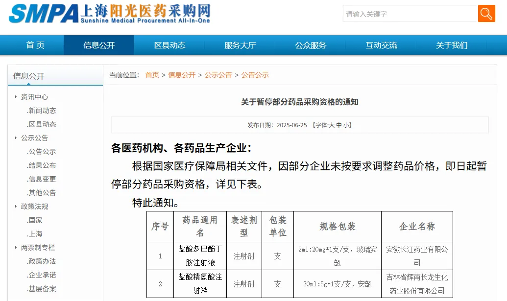 6月25日,上海阳光医药采购网发布《关于暂停部分药品采购资格的通知》,根据国家医疗保障局相关文件,因部分企业未按要求调整药品价格,即日起暂停部分药品的采购资格。