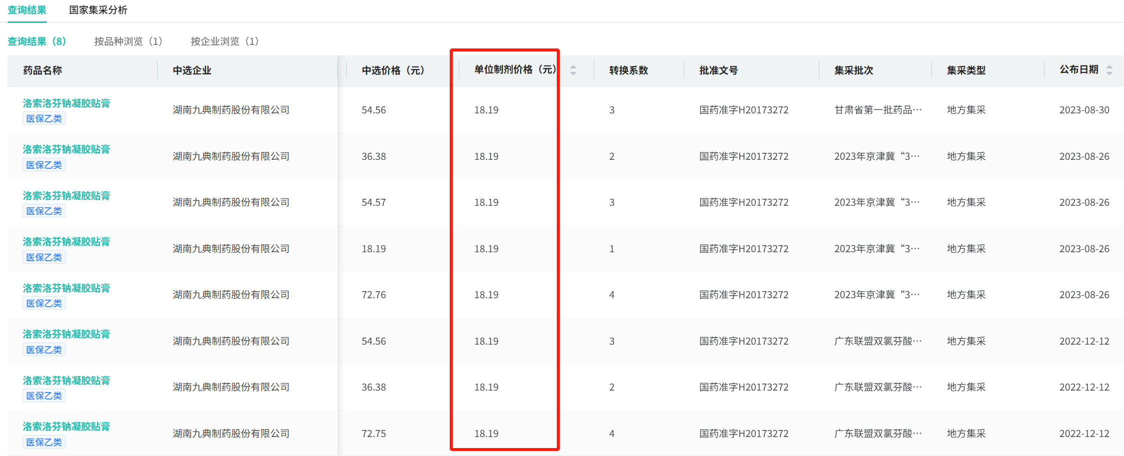 过去洛索洛芬钠凝胶贴膏经历过几轮省级集采,但价格上目前并未真正出现大跳水。此前省级带量采购中,九典控制降幅在25%左右,仍维持较高价格区间。