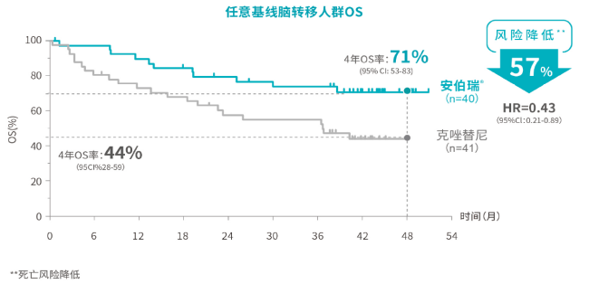 布格替尼脑转移数据突出。ALTA-1L结果显示,对于基线脑转移的患者具有突破性疗效:经独立评审委员会评估中位PFS达到24个月,对照组5.6个月(HR=0.25,P<0.0001),相比对照组显著降低疾病进展或死亡风险75%。布格替尼片一线治疗基线脑转移患者的4年OS率71%,降低死亡风险57%(对照组4年OS率44%,HR=0.43,P=0.02),这意味着接近3/4的脑转移患者可实现4年(以上)的长生存,同时布格替尼是首个实现临床疗效和生活质量显著获益的ALK抑制剂。