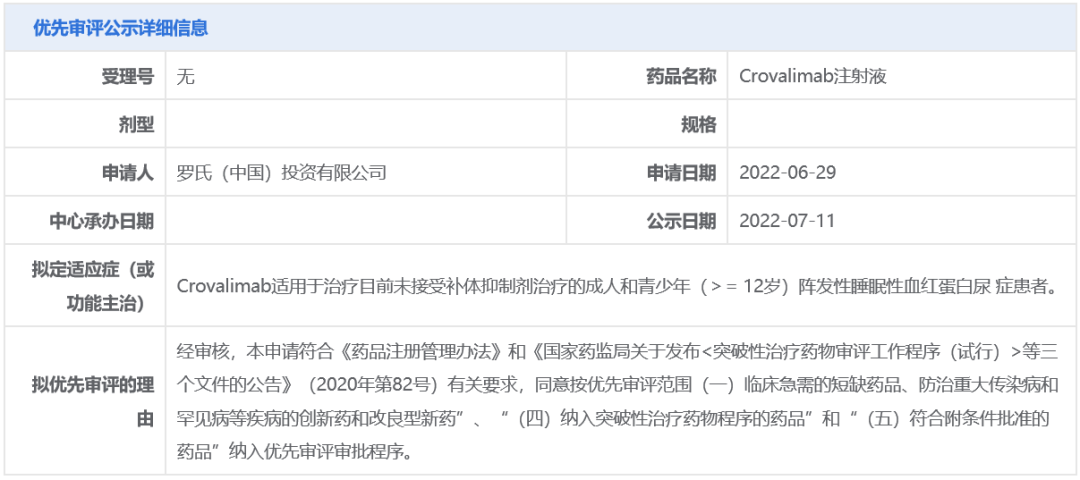 2022年8月10日,中国国家药品监督管理局(NMPA)正式受理罗氏制药提交的治疗阵发性睡眠性血红蛋白尿症(PNH)的补体创新药物Crovalimab/珂罗利单抗在中国上市申请(NDA/BLA),并给予Crovalimab优先审评资格。本品暂未在美国或者欧洲递交上市申请,这可能是罗氏制药史上首个以中国作为全球首发的创新药物!