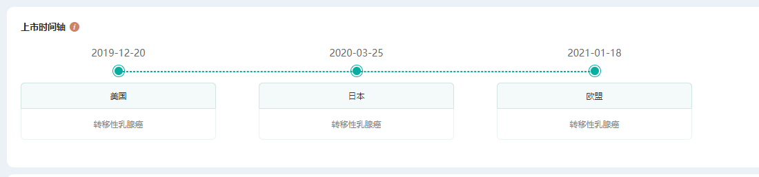 据药融云数据库查询,Enhertu最早于2019年12月20日在美国首发上市,获批适应症为转移性乳腺癌。2020年3月又在日本上市,2021年1月又在欧盟获批,目前已在中国递交了上市申请,处于审评审批中。