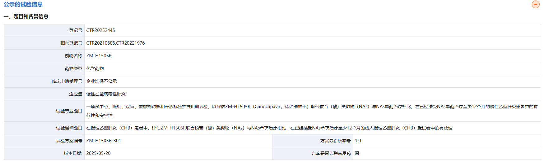 近日,据药物临床试验与信息公示平台披露,挚盟医药自主研发的1类乙肝新药 ZM-H1505R(Canocapavir,科诺卡帕韦)正式启动III期临床试验,标志着慢性乙肝治疗领域迎来重大进展。这款强效HBV核衣壳抑制剂凭借其全新化学骨架和突破性疗效,有望为数千万患者提供功能性治愈的新选择。
