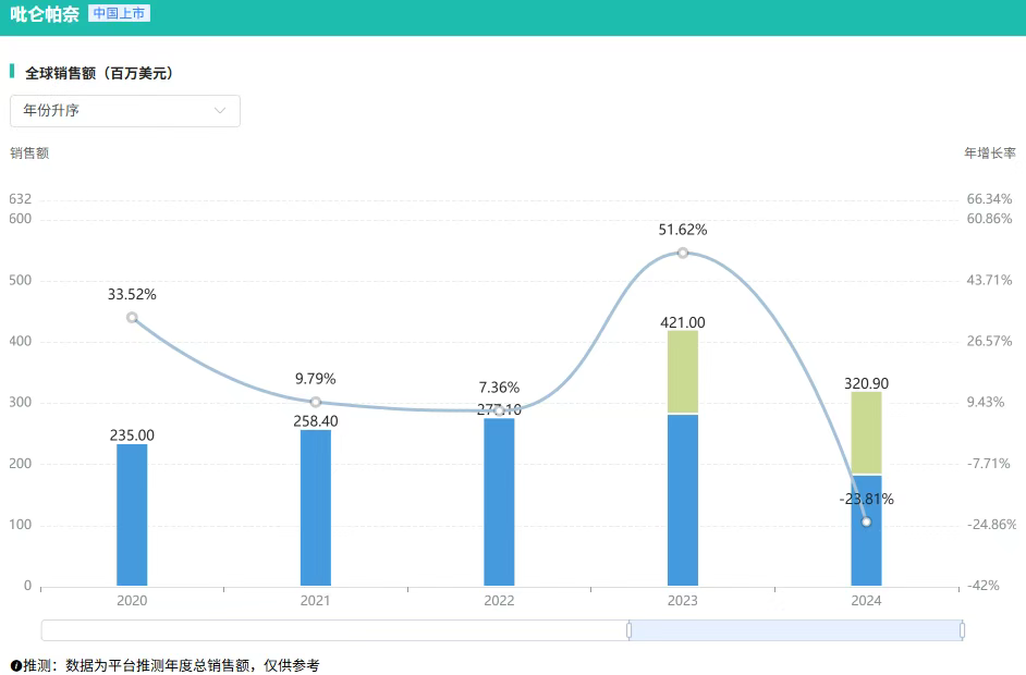据摩熵医药销售数据,自上市以来,吡仑帕奈的全球销售额实现逐年增长,2022年销售额达2.77亿美元,2023年同比增长51.62%,至4.21亿美元。