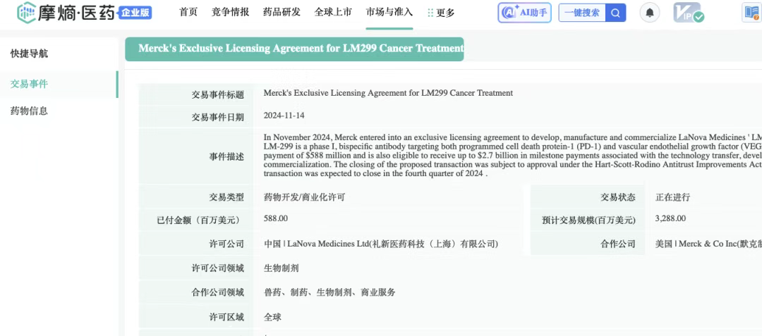 此前在2024年11月14日,美国制药巨头默沙东(MSD)宣布,已与中国礼新医药正式签署了一项规模最多高达32.88亿美元的战略合作协议。根据协议条款,默沙东将独家获得礼新医药正在研发的创新PD-1/VEGF双特异性抗体LM-299(默沙东研发代码MK-2010)的全球开发权、生产权及商业化许可。税前首付款即达5.88亿美元。