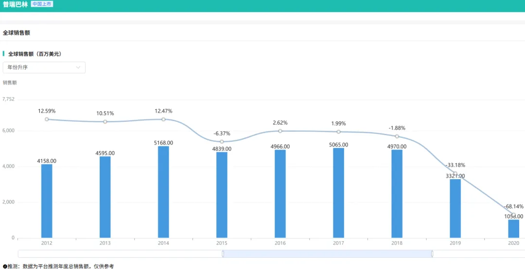 据摩熵医药数据,普瑞巴林全球销售额于2014年达到峰值,约51.68亿美元。近年来由于专利到期、仿制药的获批上市,销售额断崖式下滑,2020年仅剩10.58亿美元。