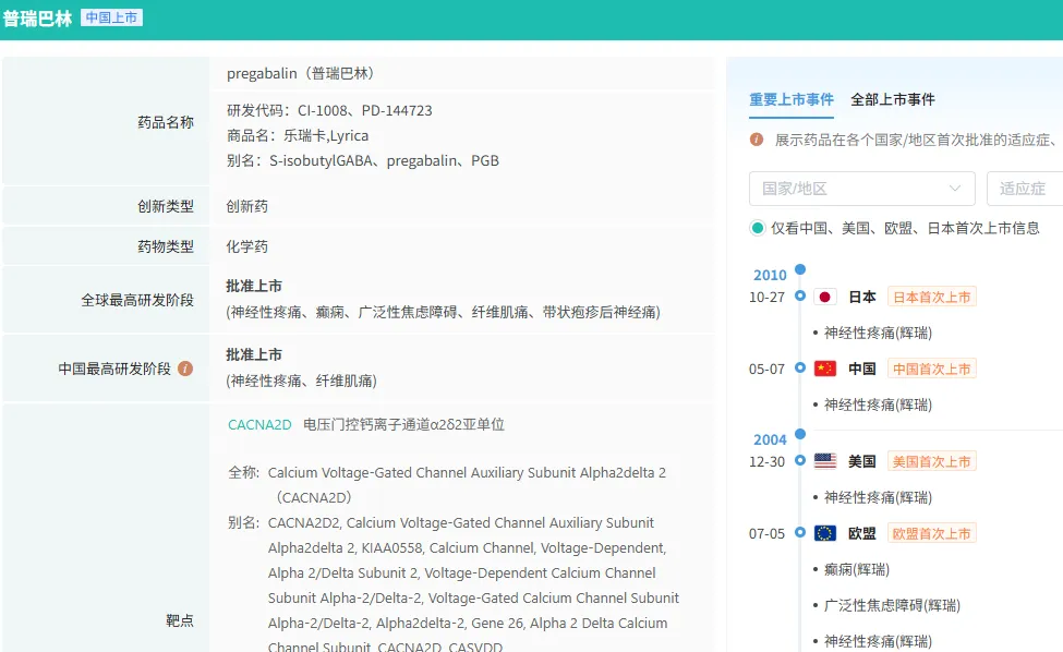 在国内,原研普瑞巴林(商品名为乐瑞卡)于2010年5月被NMPA批准用于治疗带状疱疹后神经痛,2018年10月获批用于纤维肌痛综合征。2017年,普瑞巴林进入国家医保目录,2018年纳入基药目录。