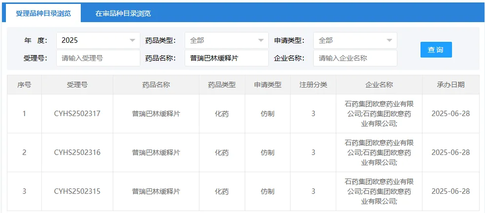 6月28日,CDE官网显示,石药集团欧意药业有限公司提交的3类仿制化药普瑞巴林缓释片上市申请已获受理。