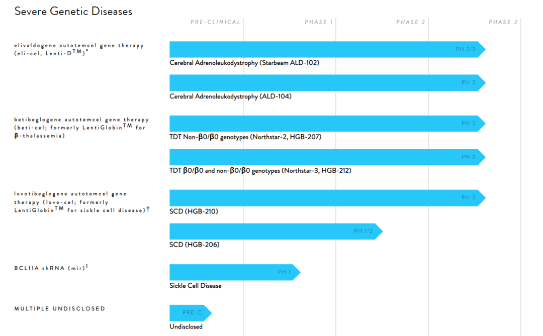 β地中海贫血是一种罕见的遗传性血液病,由β-珠蛋白基因突变引起,其特征是成人血红蛋白生成显著减少或缺失。患者会出现严重贫血并需要终生输血。尽管治疗取得了进步,输血技术得到改进,但输血只能暂时解决贫血症状。而定期输血也带来了严重的并发症——铁超负荷,导致脏器功能异常,增加死亡率。有数据表明:过去十年中,输血依赖型β地中海贫血患者的死亡年龄中位数是37岁。蓝鸟生物估计,美国约有1,300-1,500人患有输血依赖型β-地中海贫血。