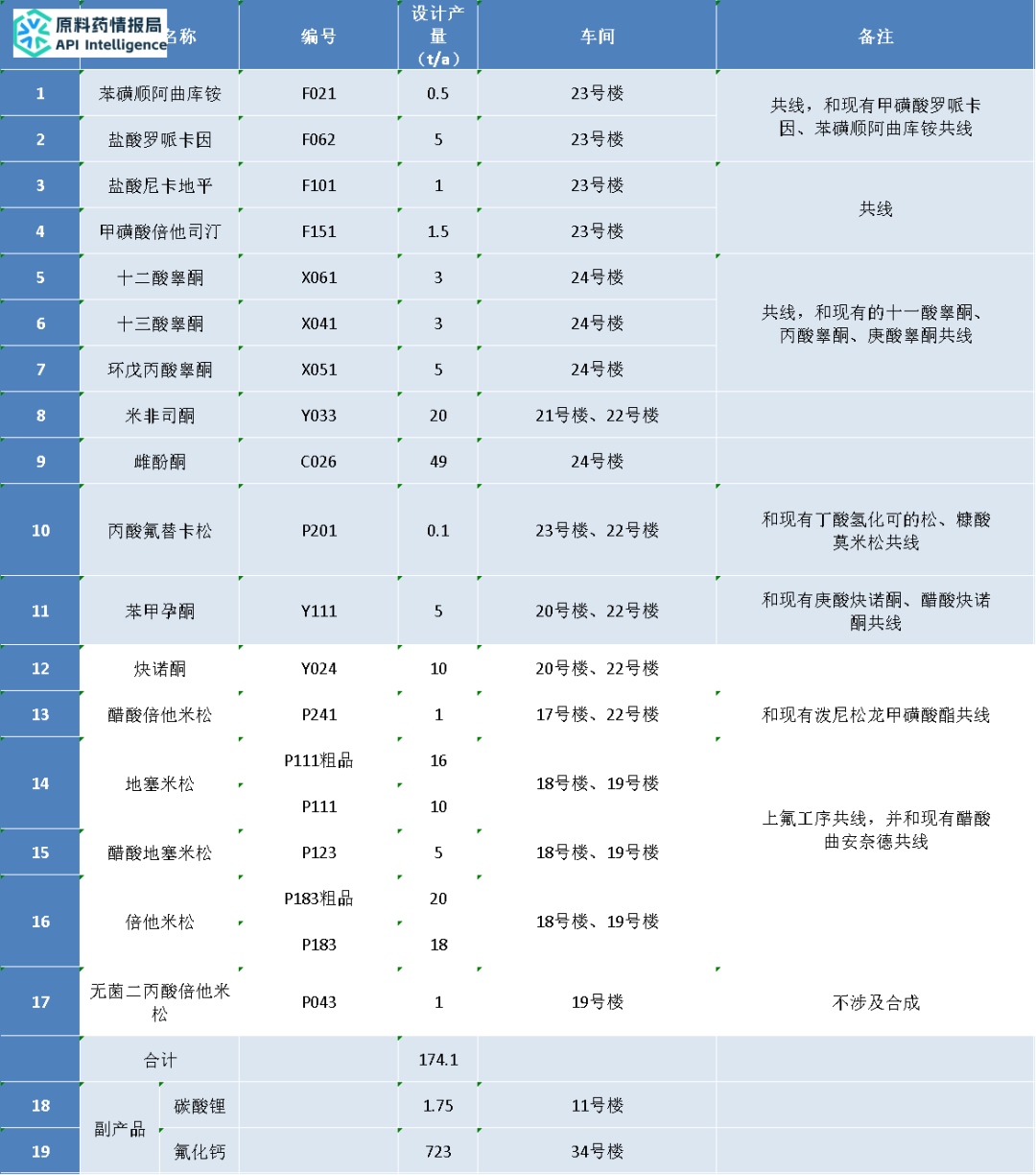 项目规模:建设年产0.5吨F021、5吨F062、1吨F101、1.5吨F151、3吨X061、3吨X041、5吨X051、20吨Y033、49吨C026、0.1吨P201、5吨Y111、10吨Y024、1吨P241、10吨P111(含16吨P111粗品)、5吨P123、18吨P183(含20吨P183粗品)、1吨P043、1.75t/a副产碳酸锂、747t/a副产氟化钙项目生产线,建设后形成年产174.1吨原料药的生产能力,并副产1.75t/a碳酸锂和723t/a氟化钙。