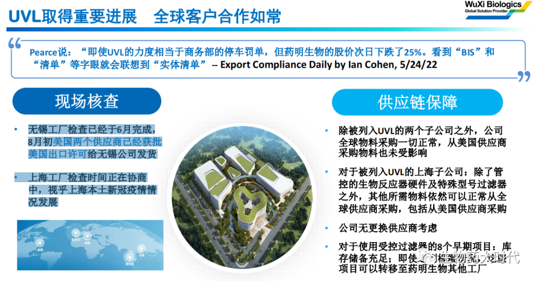 UVL取得重要进展,全球客户合作如常。药明生物无锡工厂检查已经于6月完成, 8月初美国两个供应商已经获批,美国出口许可给无锡公司发货。上海工厂检查时间正在协商中,视乎上海本土新冠疫情情况发展。