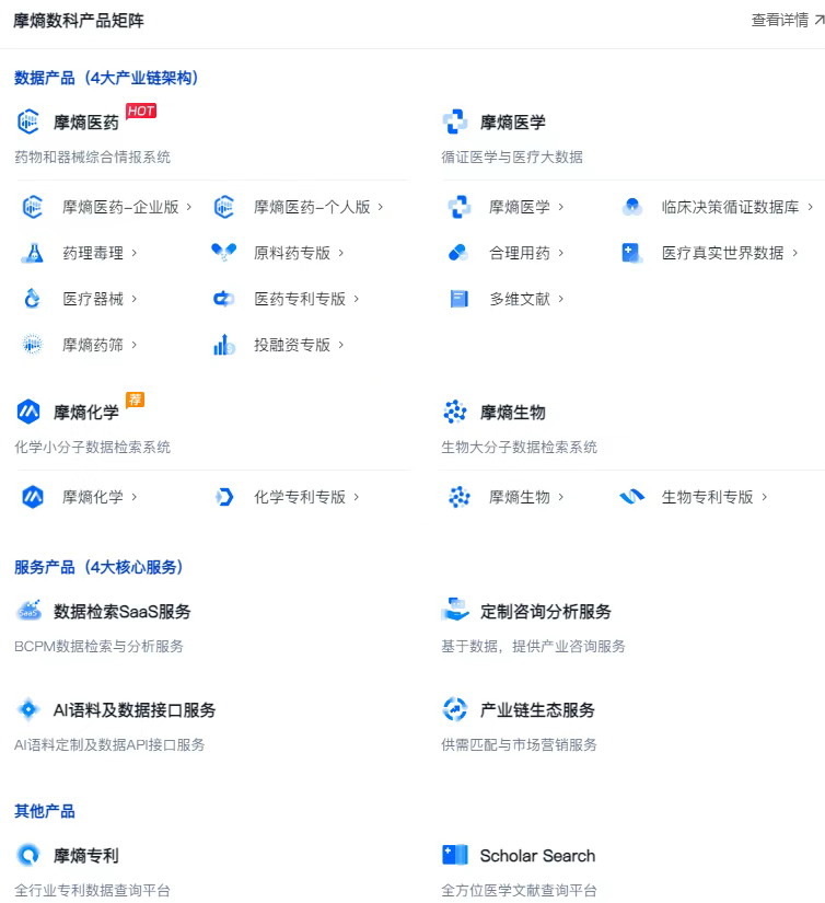 目前,平台已覆盖超10万个数据源,高质量结构化数据超50亿,形成200多个专业数据产品,涵盖摩熵生物、摩熵化学、摩熵医药、摩熵医学、摩熵院销智策(提供垂直到省市县层面颗粒度的院内销售数据)等多个板块。注册用户超60万,其中包括个人付费用户5000+,企业付费用户1000+,为政、产、学、研、医、投六大客户群体的决策者提供精准、全面、实时的数据支持。