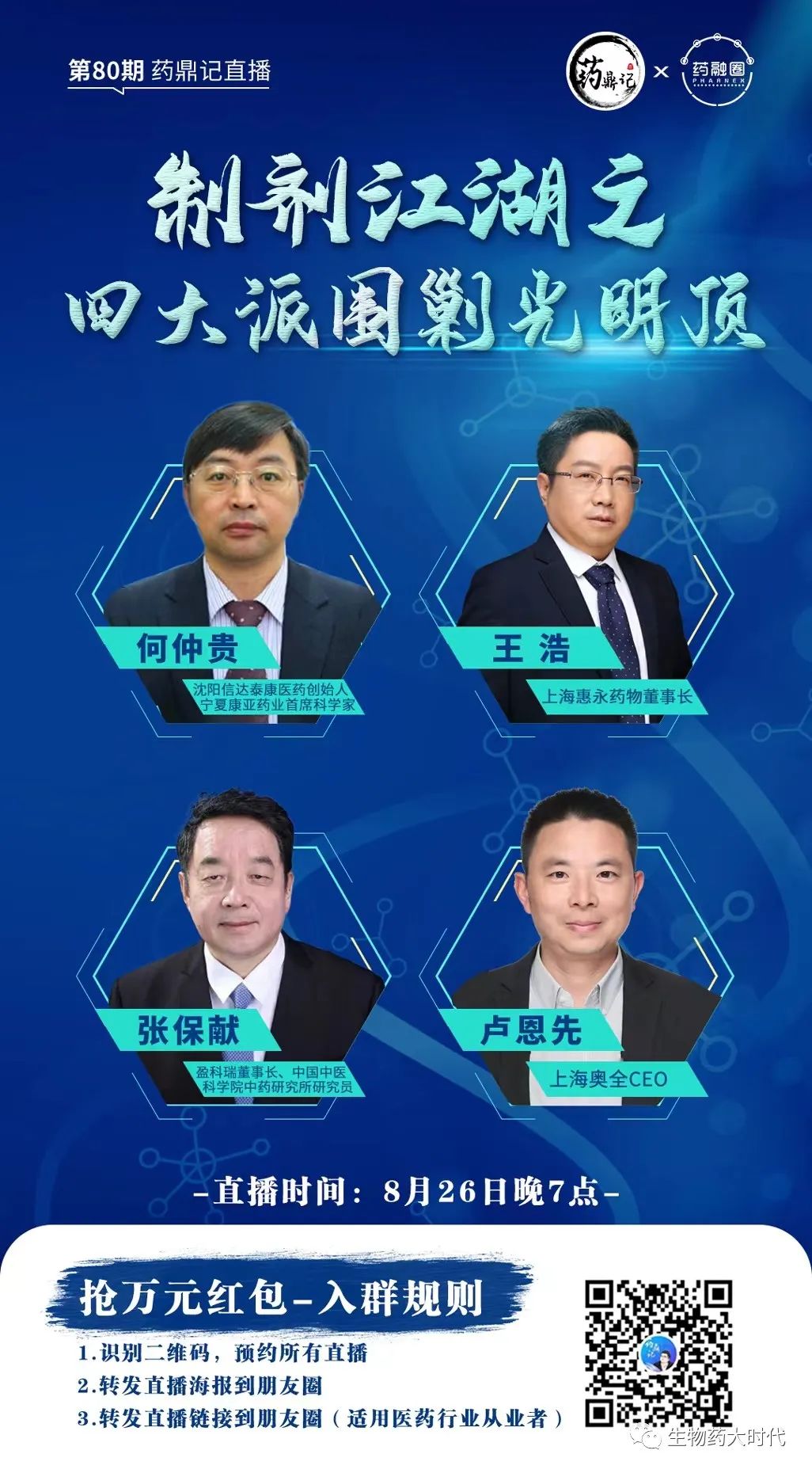 8月26日晚上19点,药鼎记直播间邀请了四位嘉宾,分别是:沈阳信达泰康医药科技有限公司创始人何仲贵教授,盈科瑞董事长、中国中医科学院中药研究所研究员张保献教授、上海惠永药物研究有限公司董事长王浩、上海奥全CEO卢恩先 ,将进行特殊递送制剂的强强对话,干货满满,欢迎识别下图“二维码”进行预约。