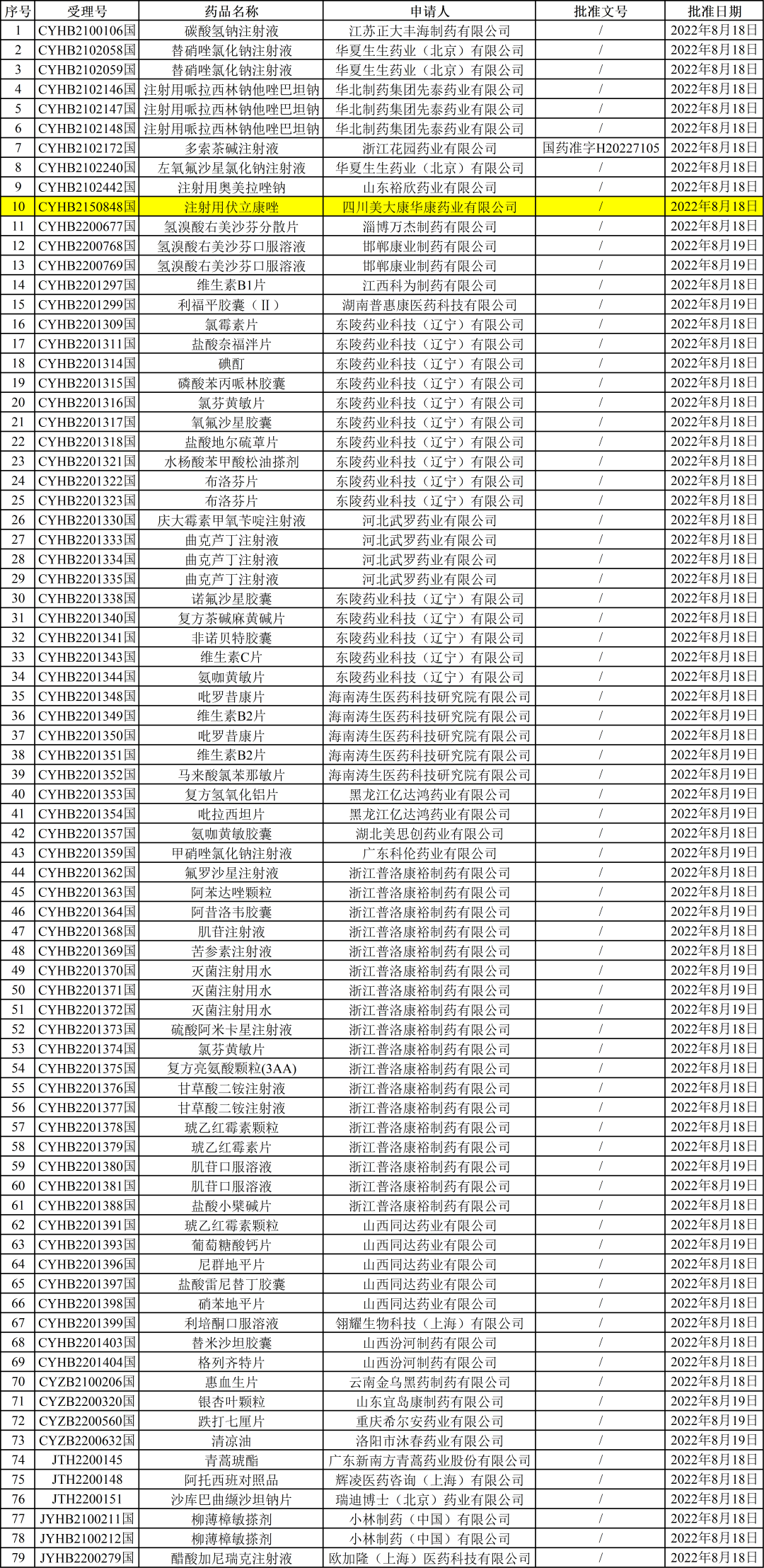 NMPA发布2022年08月23日药品批准证明文件待领取信息,共79个受理号获批,其中,仅有1个一致性受理号过评,为四川美大康华康药业有限公司的注射用伏立康唑。