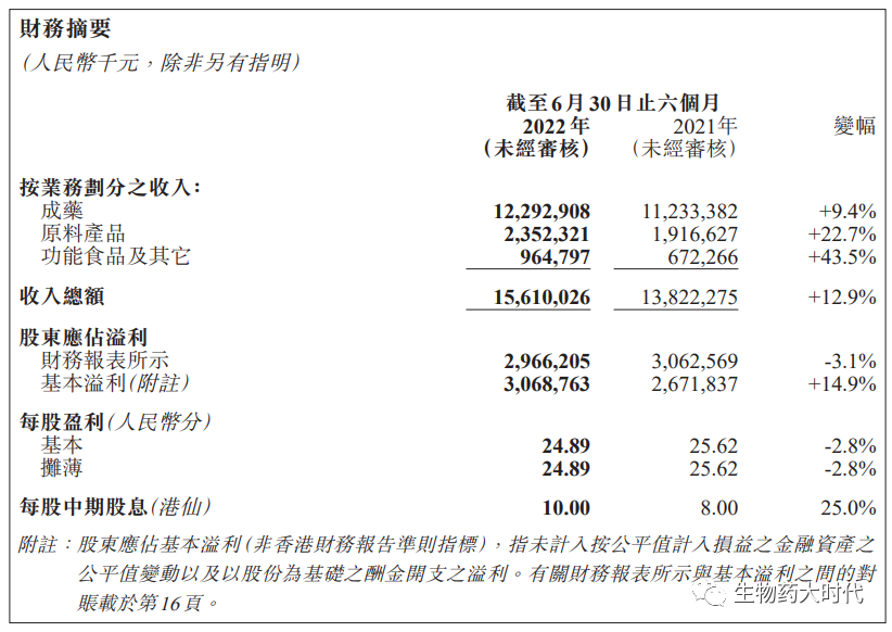 按业务划分,成药、原料产品、功能食品及其它营收分别为:122.93亿元、23.52亿元、9.65亿元。