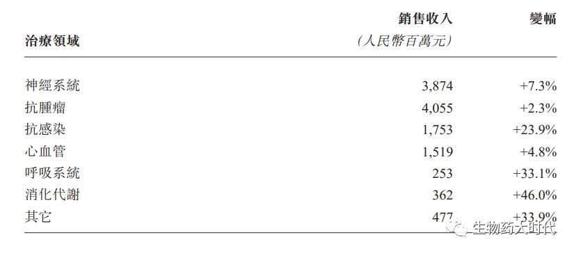 2022年上半年,石药集团成药业务的销售收入增长9.4%至人民币122.93亿元。按主要治疗领域的销售情况如下: