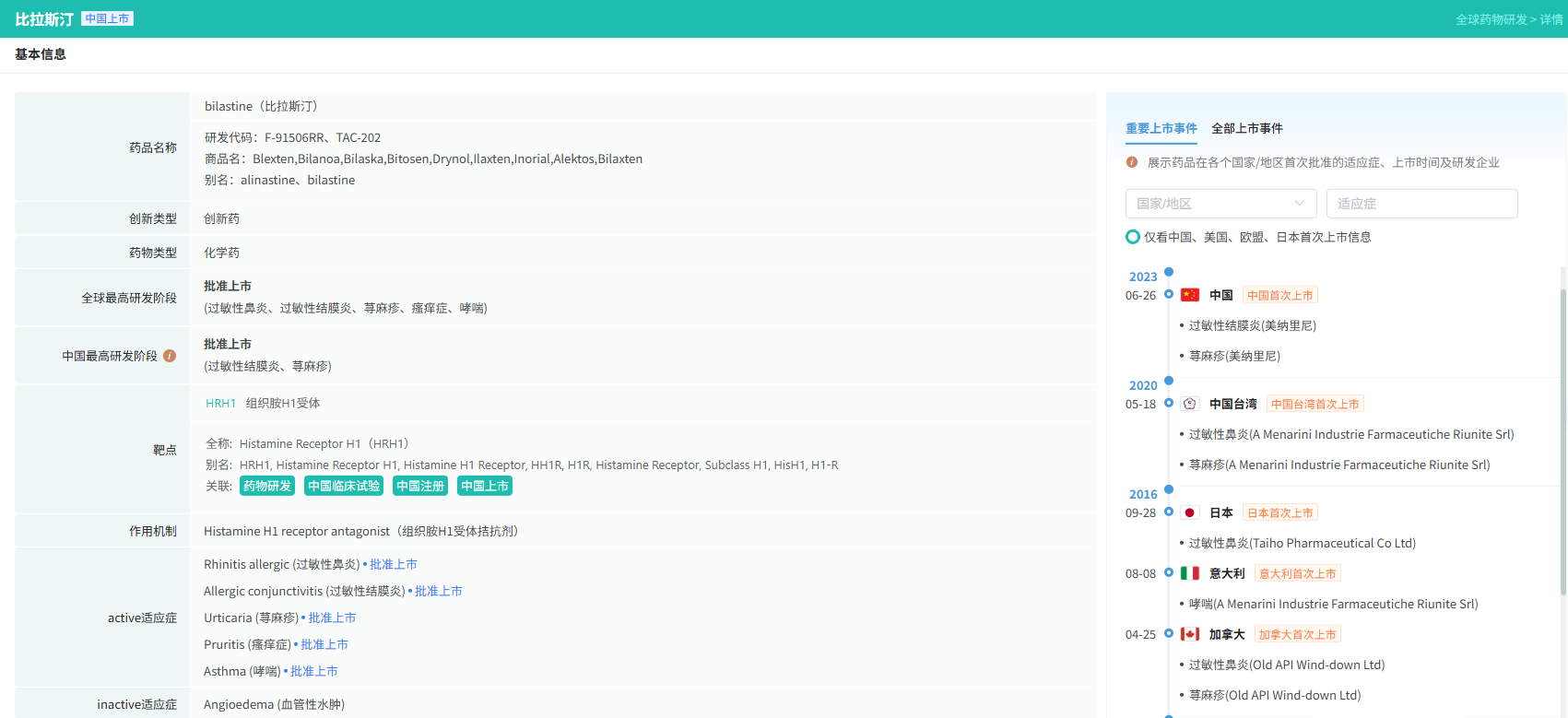 1. 抗组胺药:通过阻断组胺H1受体缓解症状,是过敏性鼻炎、荨麻疹的一线用药。其中代表药物包括第二代抗组胺药物氯雷他定、西替利嗪,不易透过血脑屏障,嗜睡等副作用较少,安全性高,适合儿童、驾驶员及需集中注意力者;此外还包括新型药物(如比拉斯汀片),比拉斯汀片(力敏能®)于2023年获NMPA批准上市,用于荨麻疹治疗,30分钟快速起效,疗效持续24小时,对大脑H1受体占用率低,对认知功能影响小,适用于青少年及老年患者,特殊人群(如肝肾功能不全者)亦可安全使用。