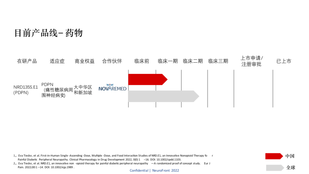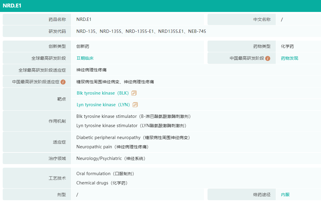 此外,神领锐对目前全球在研治疗糖尿病周围神经痛的药物进行了细致的调研,发现许多在研药物要么临床失败了,要么还处于1期临床,真正经过概念性验证的药物少之又少,因此NRD.E1针对糖尿病周围神经痛这一适应症正处于领先地位。