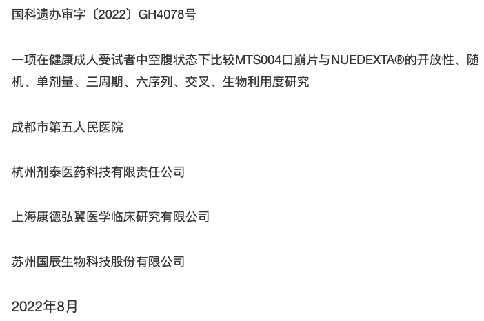 2022年8月,“一项在健康成人受试者中空腹状态下比较MTS004口崩片与NUEDEXTA®的开放性、随机、单剂量、三周期、六序列、交叉、生物利用度研究”通过遗传办审批。