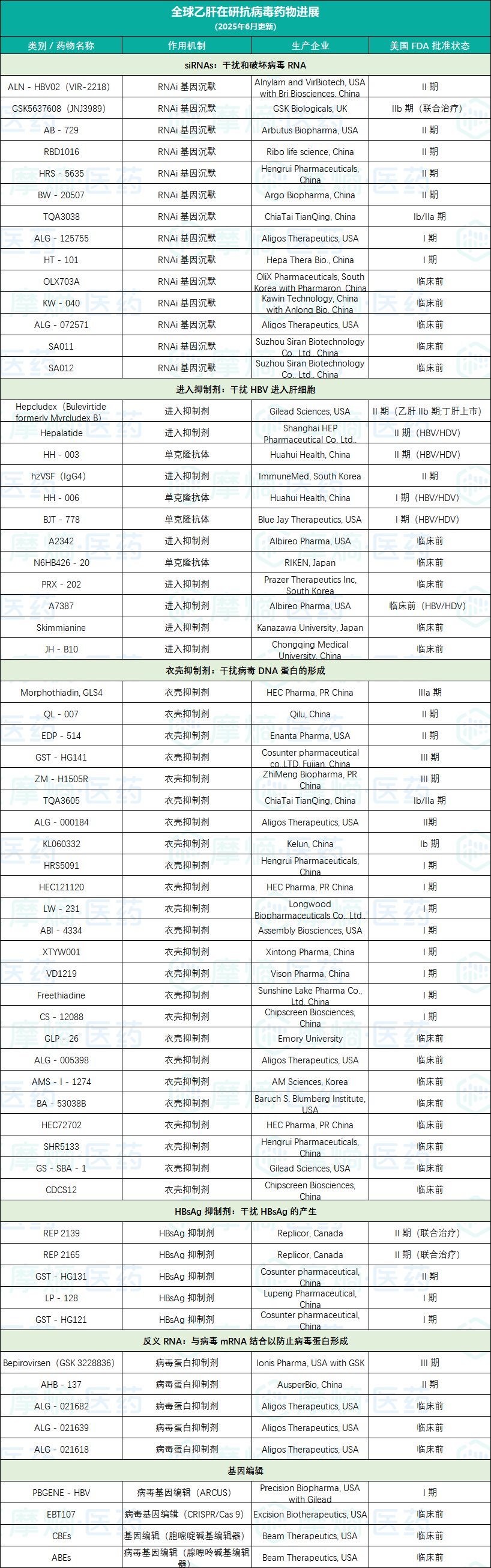 附:全球乙肝在研抗病毒新药进展统计表(2025年6月更新)