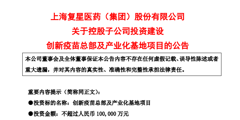 同日,复星医药发布公告:经公司第九届董事会第十三次会议审议通过,同意控股子公司上海复星医药产业发展有限公司(以下简称"复星医药产业")及/或其控股子公司复星安特金(成都)生物制药有限公司(以下简称"安特金")投资不超过人民币10亿元在成都天府国际生物城建设"创新疫苗总部及产业化基地项目"。