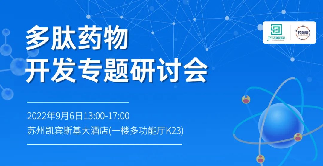 2022年9月6日13:00-17:00,药融圈联合健元医药在苏州凯宾斯基大酒店共同举办多肽药物开发专题研讨会,将重点讨论@多肽药物开发技术及思路、@多肽药物质量研究难题和策略选择等问题,希望能给行业带来启示。