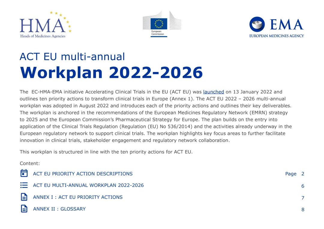 8月30日,欧洲委员会(EC)、药品机构负责人(HMA)和欧洲药品管理局(EMA)发布欧盟加速临床试验研究(ACT-EU)2022-2026年工作计划。工作计划指出欧洲临床试验的监管格局复杂,不同的专家组在不同的领域工作,从发布指南,提供科学建议,到批准临床试验,为新药或治疗策略提供证据,缺乏一个明确的共同框架。