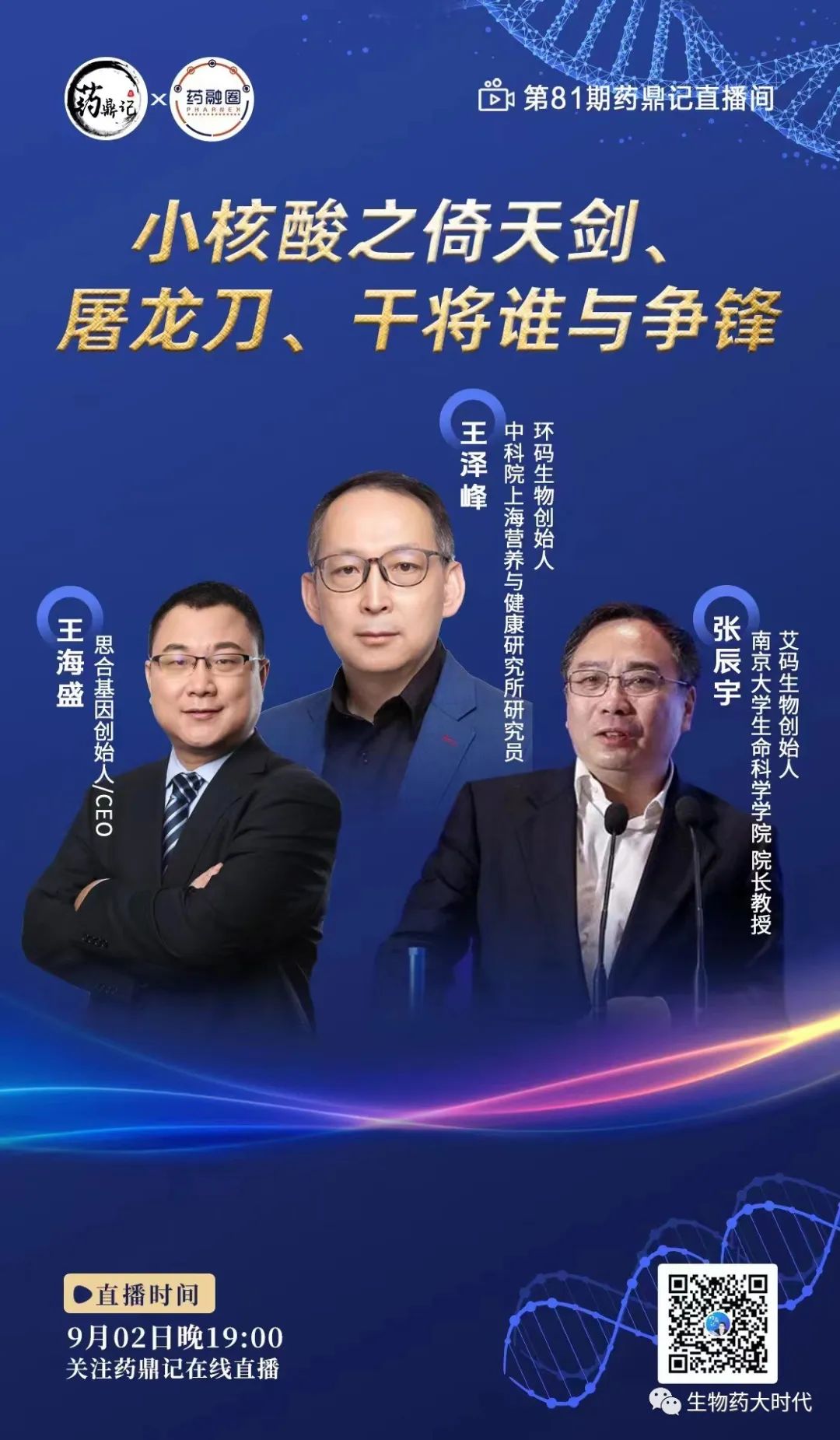 9月2日晚上19点,药鼎记直播间邀请了三位嘉宾,分别是:环码生物创始人、中科院上海营养与健康研究所研究员王泽峰,思合基因创始人/CEO王海盛,艾玛生物创始人、南京大学生命科学院院长教授张辰宇,将进行核酸药物创新强强对话,干货满满,欢迎点击文章顶部“预约按钮”或者识别下图“二维码”进行预约。