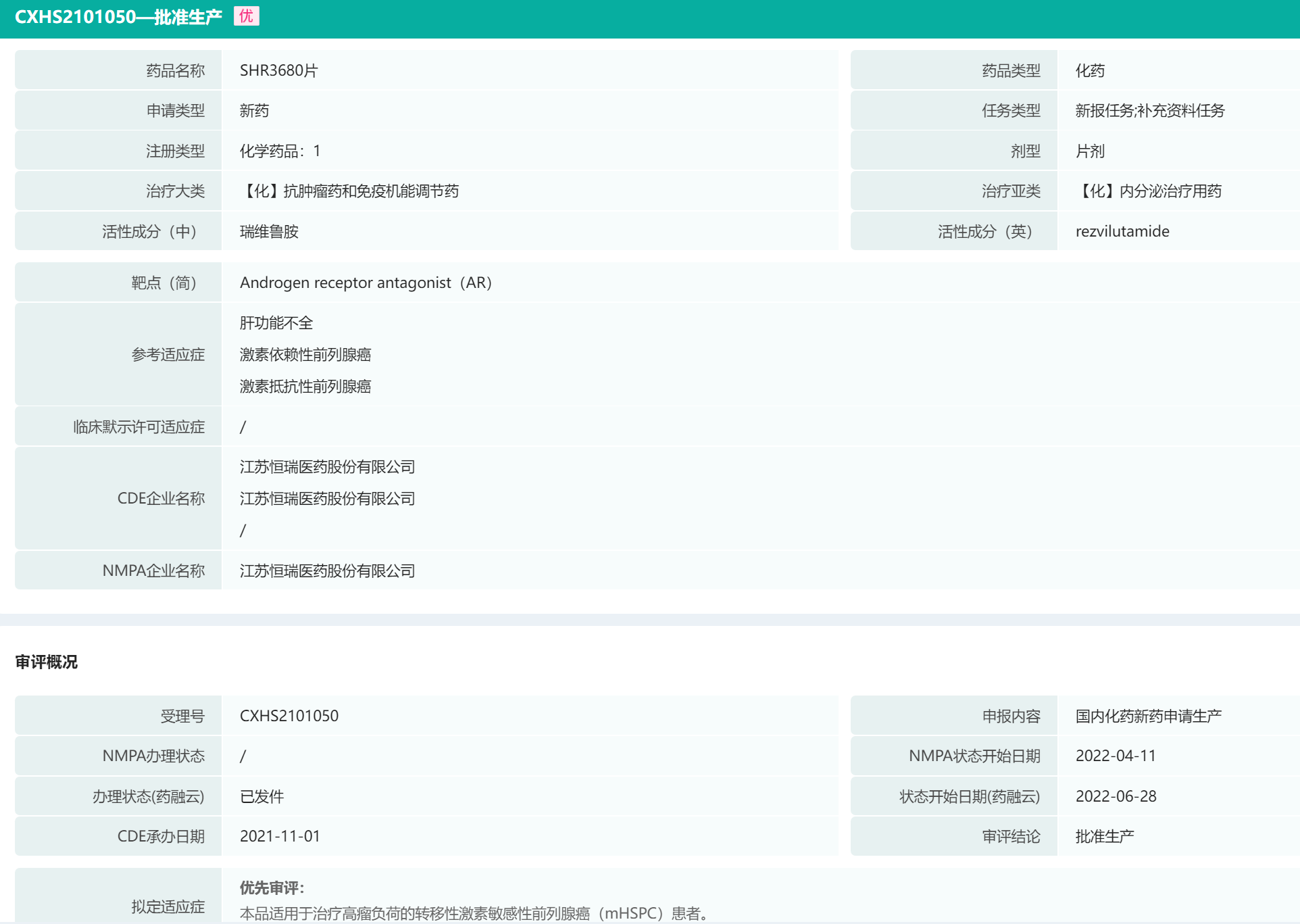 恒瑞医药瑞维鲁胺片获批信息(部分)