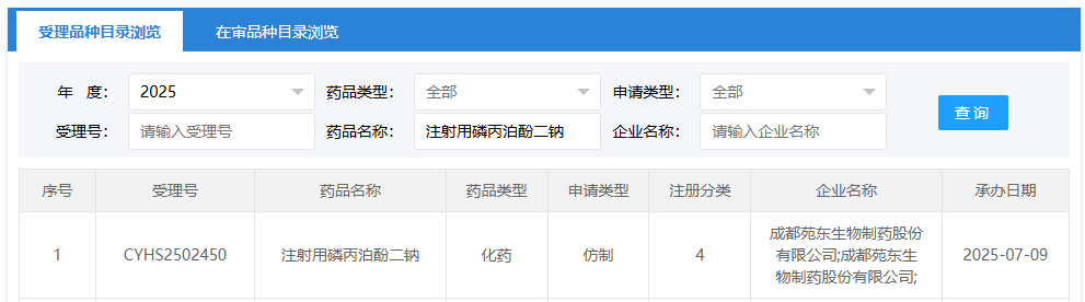 7月9日,CDE官网显示,成都苑东生物制药股份有限公司提交的4类仿制化药注射用磷丙泊酚二钠上市申请已获受理,若顺利获批,有望拿下该品种的首仿资格。
