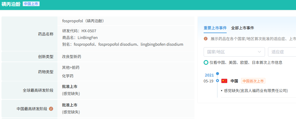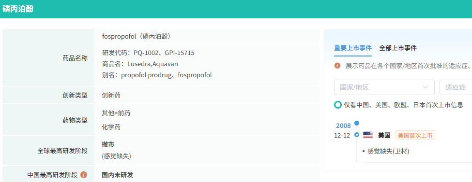 注射用磷丙泊酚二钠(Fospropofol)是一种新型短效静脉全身麻醉药,是中国首款新型水溶性丙泊酚前体药物,也是目前国外研究的最先进全身静脉麻醉药之一。该药由四川大学华西医院联合宜昌人福药业自主研发,属国家“重大新药创制”专项成果,是1.1类新药,于2021年获批正式上市。