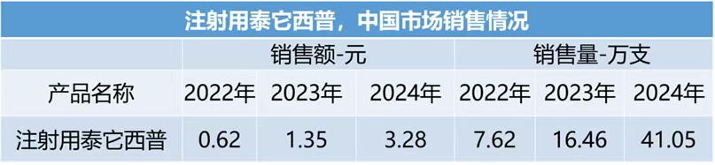 市场表现:院内市场,2022-2024年院内销售额分别为0.62、1.35和3.28亿元,销售量分别是7.62、16.46和41.05万支。