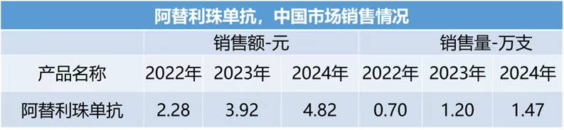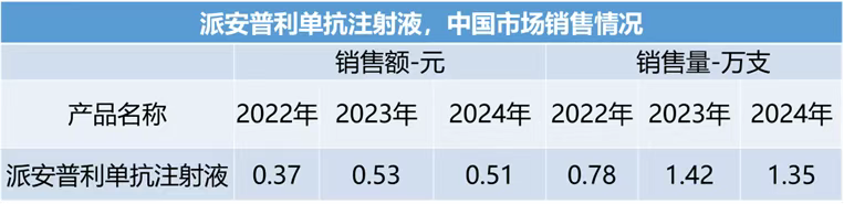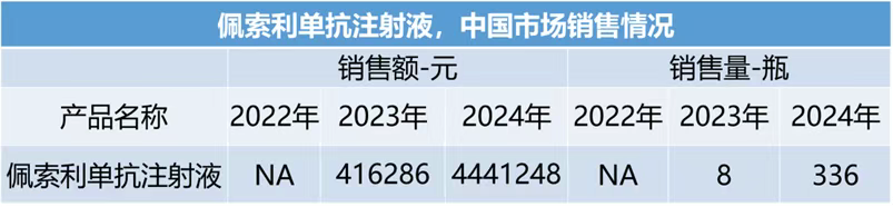 市场表现:2022-2024年院内销售额分别为2.28、3.92、4.82亿元,销售量分别是0.70、1.20和1.47万支。