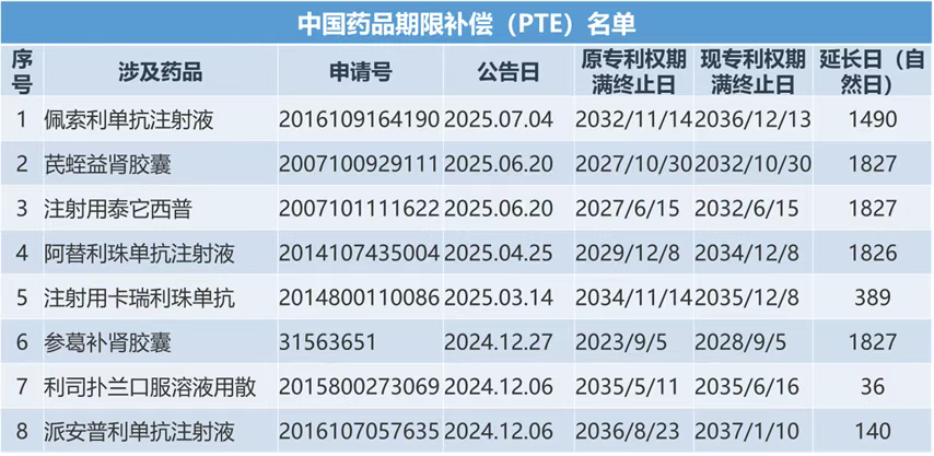 中国药品专利期限补偿制度(Patent Term Extension, PTE)落地成果揭晓—八款药品成功突围,涵盖单抗、融合蛋白、小分子及中成药四大品类(截止撰稿日2025.07.04)。