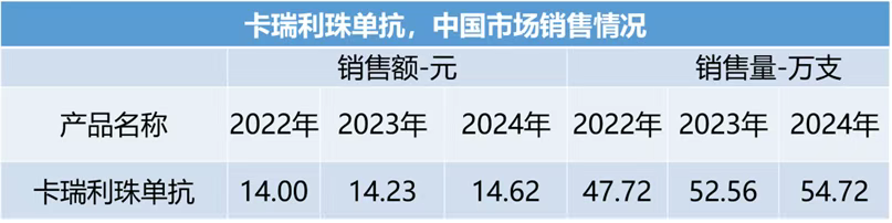 市场表现:2022-2024年院内销售额分别为14、14.23、14.62亿元,销售量分别是47.72、52.56和54.72万支。