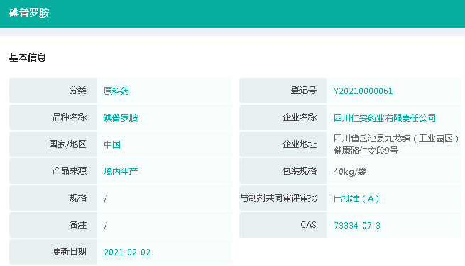 与此同时,成都西岭源药业与成都倍特药业合作开发的碘普罗胺原料药(登记号:Y20210000061)已通过国家药品监督管理局药品审评中心技术审评。