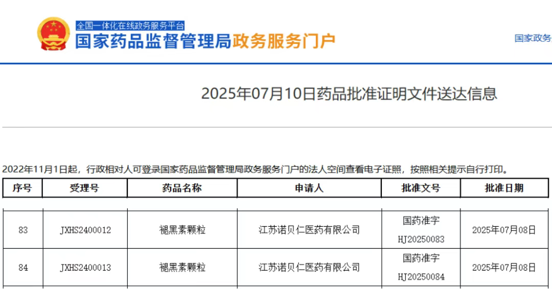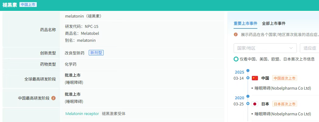 7月10日,国家药监局(NMPA)官网显示,江苏诺贝仁医药有限公司(日本Nobelpharma公司子公司)按化药注册分类5.1申报的褪黑素颗粒获批上市。该药为我国首个儿童褪黑素药品,用于改善儿童期伴随神经发育障碍的入睡困难。