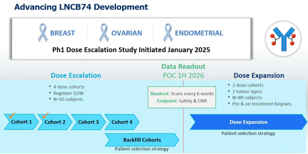 2024年11月,NextCure在癌症免疫治疗学会(SITC)年会上公布了LNCB74的临床前数据,以强调其作为治疗多种实体瘤适应症的潜力。2024年12月,NextCure宣布美国FDA接受了关于启动LNCB74治疗高B7-H4表达多种癌症的1期临床试验的IND申请。2025年1月,公司宣布LNCB74的1期试验已开始首例患者给药,正在按计划推进1期研究的剂量递增部分,研究招募了包括乳腺癌、卵巢癌和子宫内膜癌在内的多种肿瘤类型的患者。公司计划在2025年下半年启动补充队列的招募,预计将在2026年上半年提供概念验证数据。