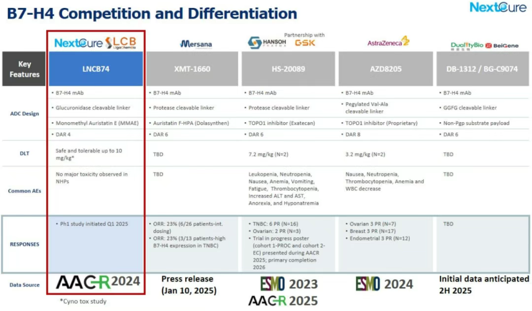 在2024年11月的业务更新中,NextCure再次决定重新确定优先级,集中资源以全力推进靶向B7-H4的ADC项目LNCB74。