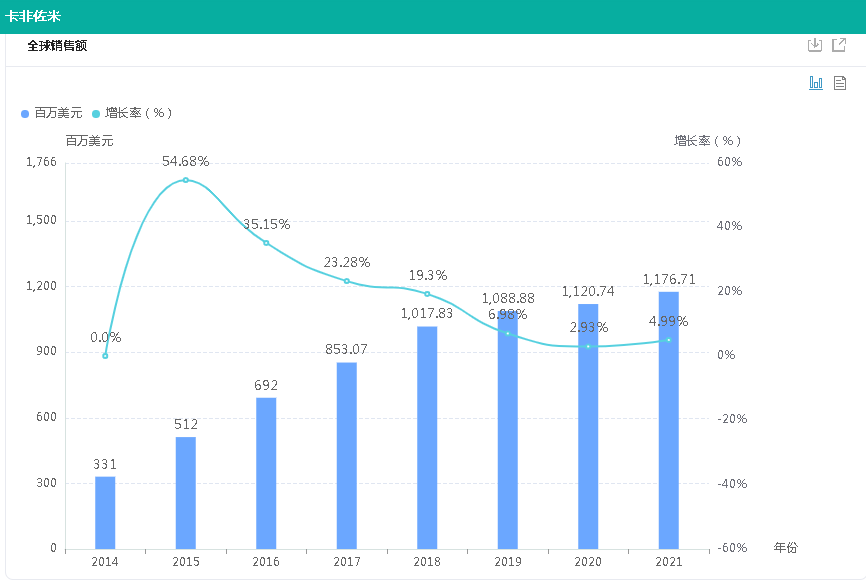 目前卡非佐米已在全球多个国家上市。据药融云估算,2018年起,卡非佐米全球销售额便突破10亿美元,并保持稳定增长,2021年为11.77亿美元。